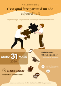 La Maison des Adolescents, située au 13 rue des Marettes à Bourgoin-Jallieu, a le plaisir de proposer son nouvel atelier parents :